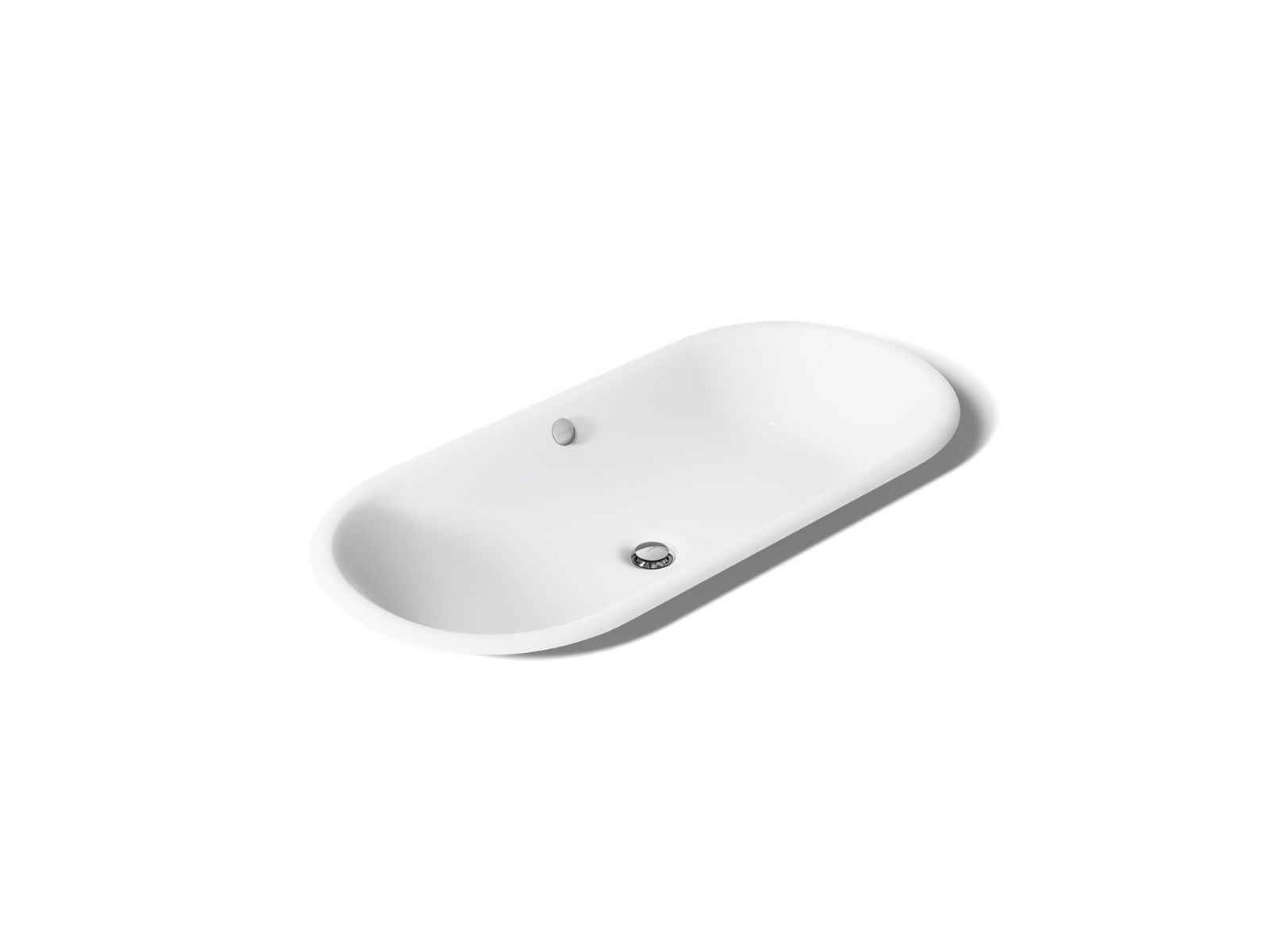 With its gently curved, organic shape, the KOHLER® Iron Plains sink combines distinctive style with the extreme durability, strength, and vintage soul of KOHLER® enameled cast iron. This 33" capsule-shaped bathroom sink with a White painted underside allows for a striking vessel installation as well as drop-in or undermount installation.