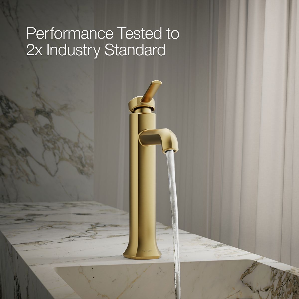 Unapologetically luxurious and truly unforgettable, KOHLER® Occasion bathroom sink faucets and accessories draw inspiration from 1960s Hollywood glamour and extravagance. Fashioned after the era’s sleek dress lines and bold car designs, the Occasion collection reflects graceful elegance, blending classic midcentury and modern design. Customize your bath with the collection’s distinctive pentagonal accents, faceted bases, flowing lines, and delicate edges. The tall single-handle bathroom sink faucet adds sleek style and function to your bathroom—in finishes designed to coordinate with the entire room.