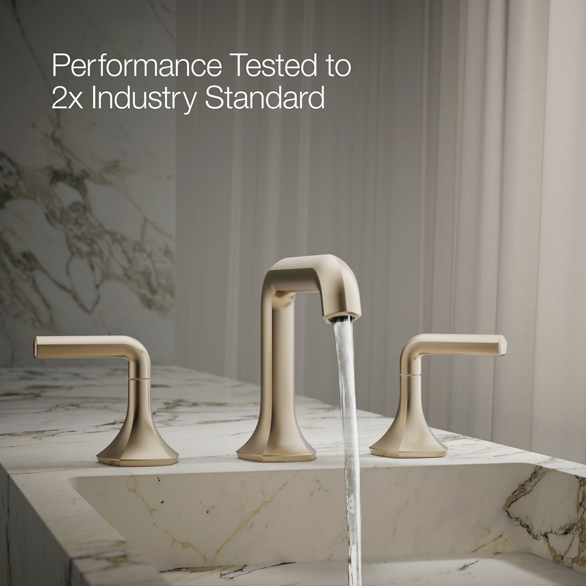 Unapologetically luxurious and truly unforgettable, KOHLER® Occasion bathroom sink faucets and accessories draw inspiration from 1960s Hollywood glamour and extravagance. Fashioned after the era’s sleek dress lines and bold car designs, the Occasion collection reflects graceful elegance, blending classic midcentury and modern design. Customize your bath with the collection’s distinctive pentagonal accents, faceted bases, flowing lines, and delicate edges. Choose a spout, handles, and finish to build your own signature design. Minimalist with soft square angles, the Occasion widespread bathroom sink faucet spout with Straight design pairs with your choice of Occasion sink faucet handles for a look as fashionable as it is functional.