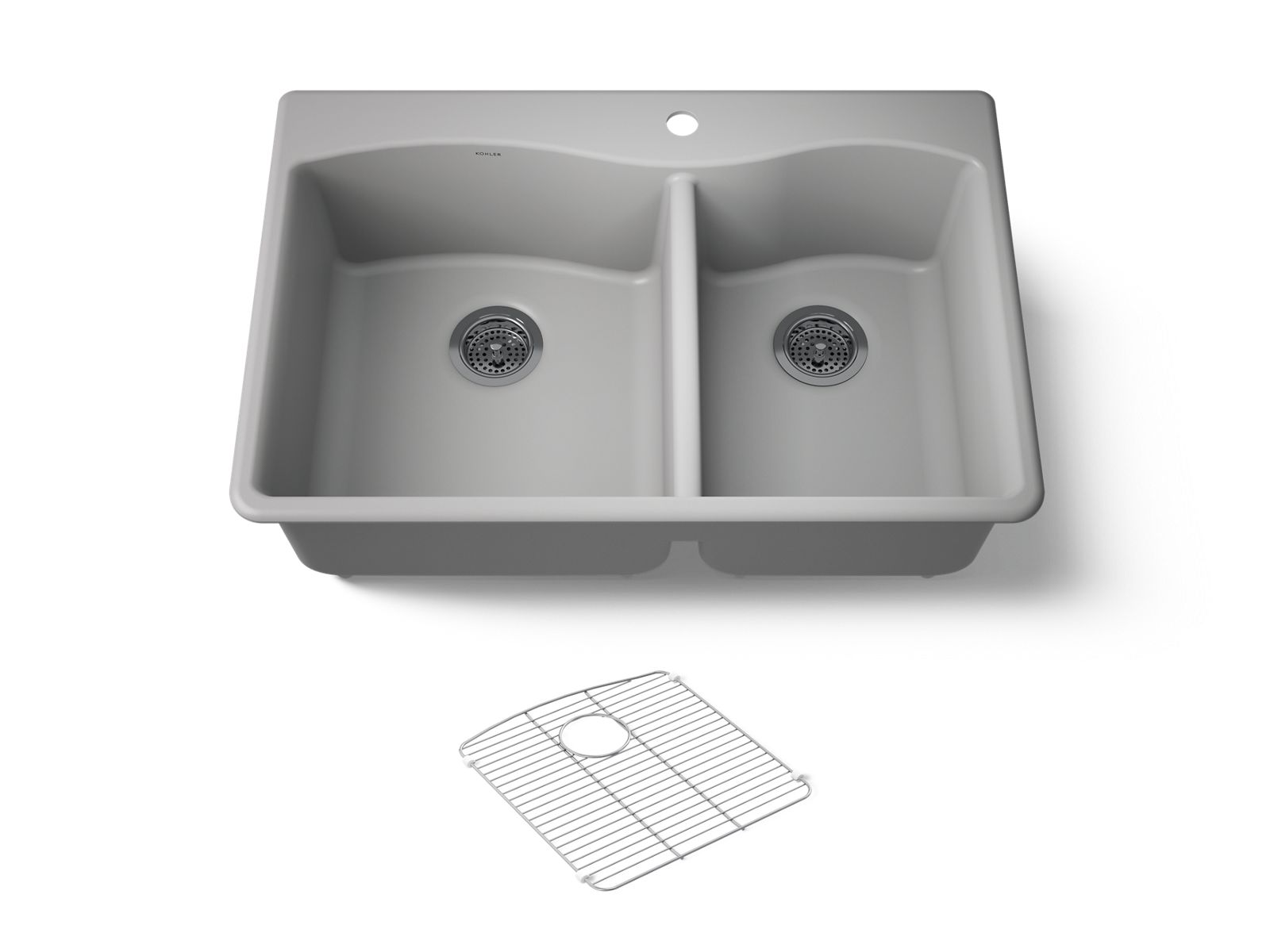 The KOHLER® Kennon® double-bowl sink features an elegant, wave-like curve that complements any kitchen decor. The Kennon® 33" top-/undermount double-bowl kitchen sink is made of KOHLER® Neoroc®, a matte-finish composite material designed for extreme durability and unmatched beauty. Richly colored to complement any countertop, Neoroc® resists scratches, stains and fading and is highly heat- and impact-resistant.
