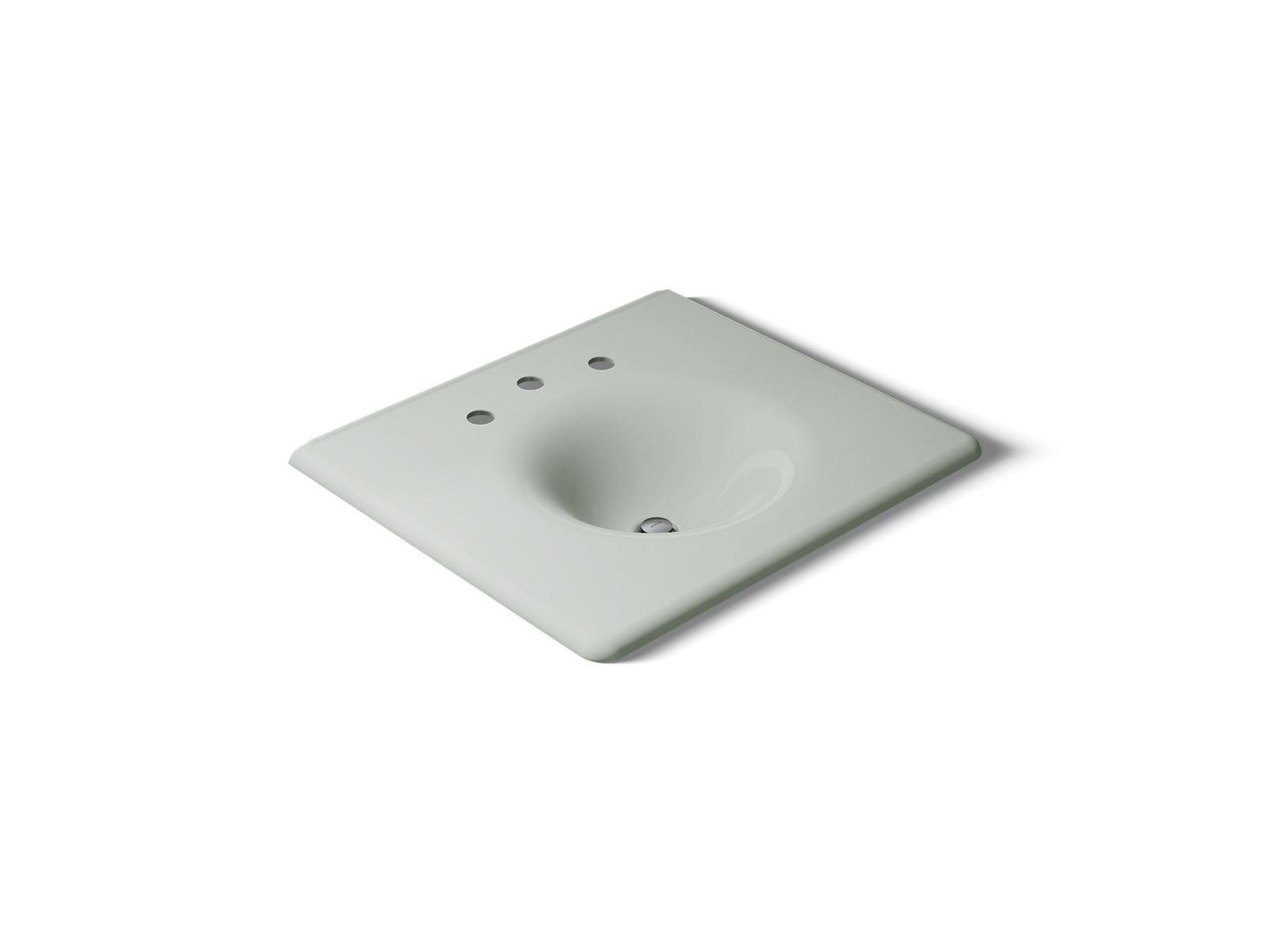 With its graceful curves, the KOHLER® Iron/Impressions sink adds elegance to the bathroom. The rectangular vanity top countertop flows seamlessly into a round basin, creating a sophisticated design element that coordinates with 24" vanities. Enameled cast iron construction makes it durable and easy to clean.