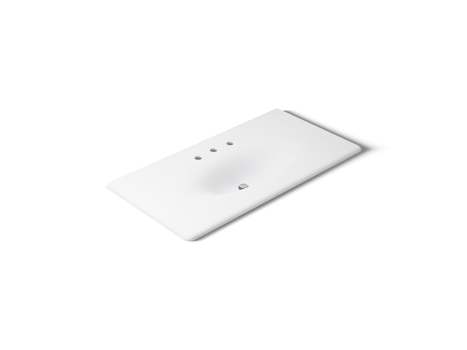 With its graceful curves, the KOHLER® Iron/Impressions sink adds elegance to the bathroom. The spacious rectangular vanity top countertop flows seamlessly into an elongated oval basin, creating a sophisticated design element that coordinates with 42" vanities. Enameled cast iron construction makes it durable and easy to clean.