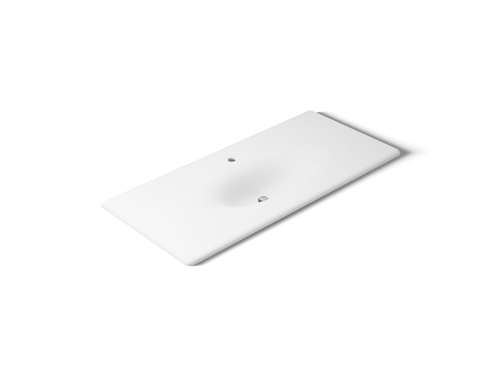 With its graceful curves, the KOHLER® Iron/Impressions sink adds elegance to the bathroom. The spacious rectangular vanity top countertop flows seamlessly into an elongated oval basin, creating a sophisticated design element that coordinates with 48" vanities. Enameled cast iron construction makes it durable and easy to clean.