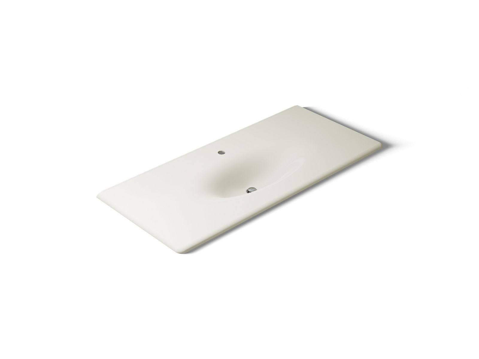 With its graceful curves, the KOHLER® Iron/Impressions sink adds elegance to the bathroom. The spacious rectangular vanity top countertop flows seamlessly into an elongated oval basin, creating a sophisticated design element that coordinates with 48" vanities. Enameled cast iron construction makes it durable and easy to clean.