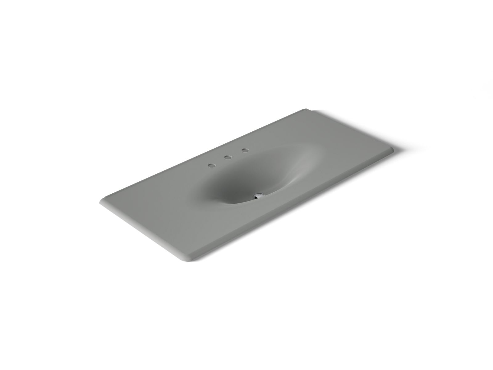 With its graceful curves, the KOHLER® Iron/Impressions sink adds elegance to the bathroom. The spacious rectangular vanity top countertop flows seamlessly into an elongated oval basin, creating a sophisticated design element that coordinates with 48" vanities. Enameled cast iron construction makes it durable and easy to clean.