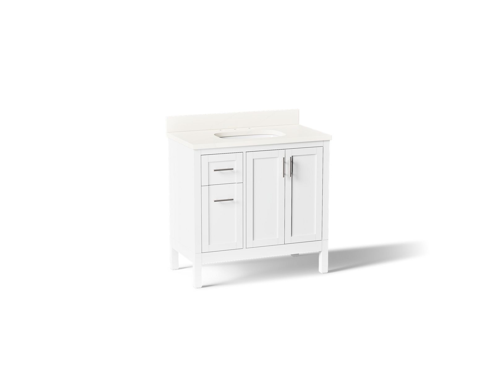 In typical Shaker style, the KOHLER® Hadron bathroom vanity set is a classic. This modest, clean design doesn’t overpower your bathroom — it blends into it — lending itself to many decorating styles. The Hadron 36" freestanding single sink vanity set includes cabinet, quartz countertop, sink, and Vibrant® Brushed Nickel hardware. Pair with any KOHLER® widespread bathroom sink faucet for your own unique touch.