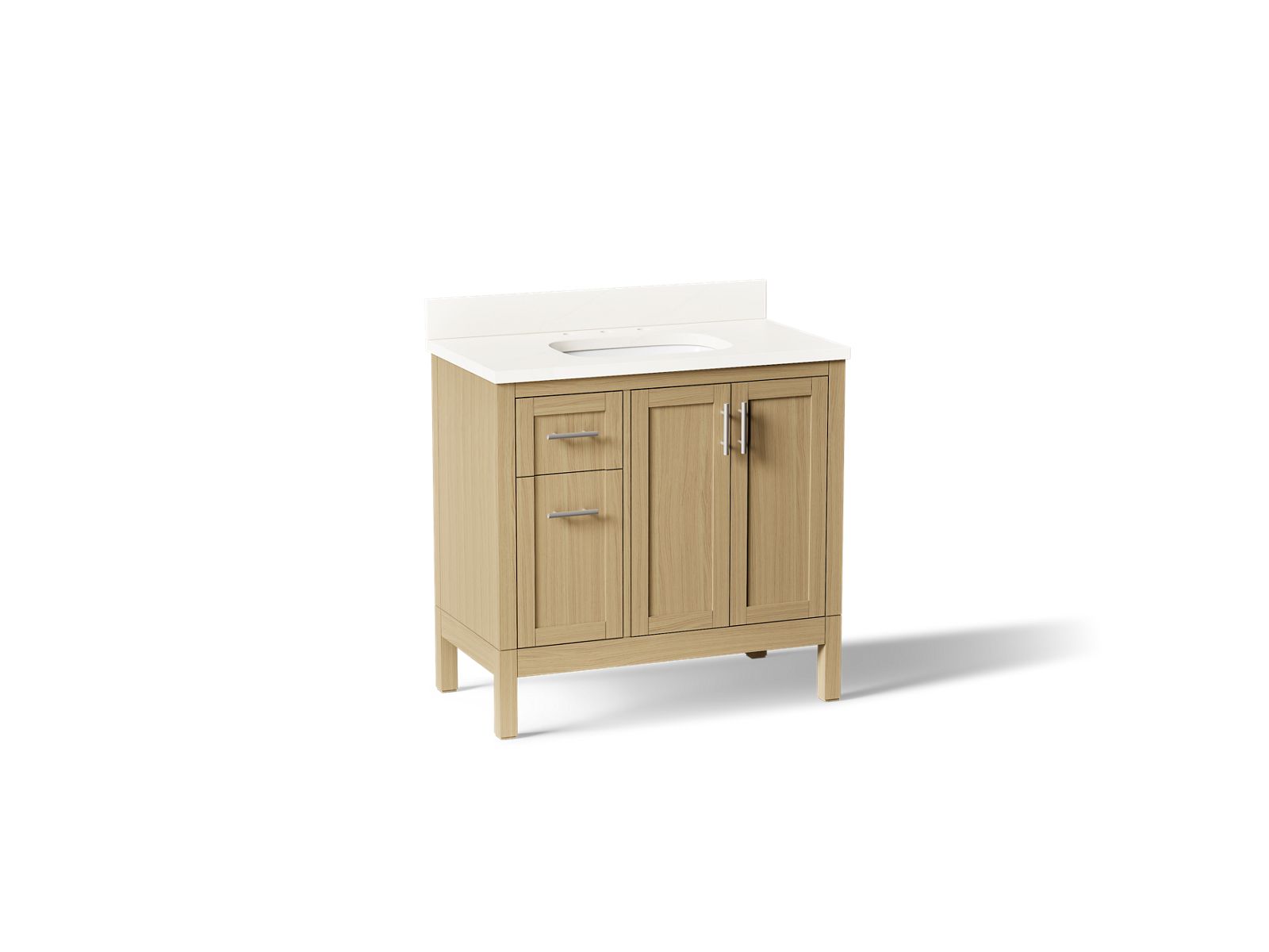 In typical Shaker style, the KOHLER® Hadron bathroom vanity set is a classic. This modest, clean design doesn’t overpower your bathroom — it blends into it — lending itself to many decorating styles. The Hadron 36" freestanding single sink vanity set includes cabinet, quartz countertop, sink, and Vibrant® Brushed Nickel hardware. Pair with any KOHLER® widespread bathroom sink faucet for your own unique touch.