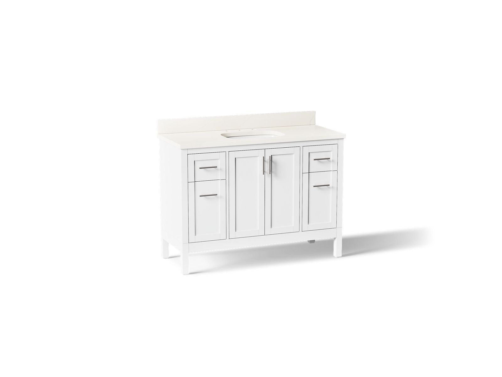 In typical Shaker style, the KOHLER® Hadron bathroom vanity set is a classic. This modest, clean design doesn’t overpower your bathroom — it blends into it — lending itself to many decorating styles. The Hadron 48" freestanding single sink vanity set includes cabinet, quartz countertop, sink, and Vibrant® Brushed Nickel hardware. Pair with any KOHLER® widespread bathroom sink faucet for your own unique touch.