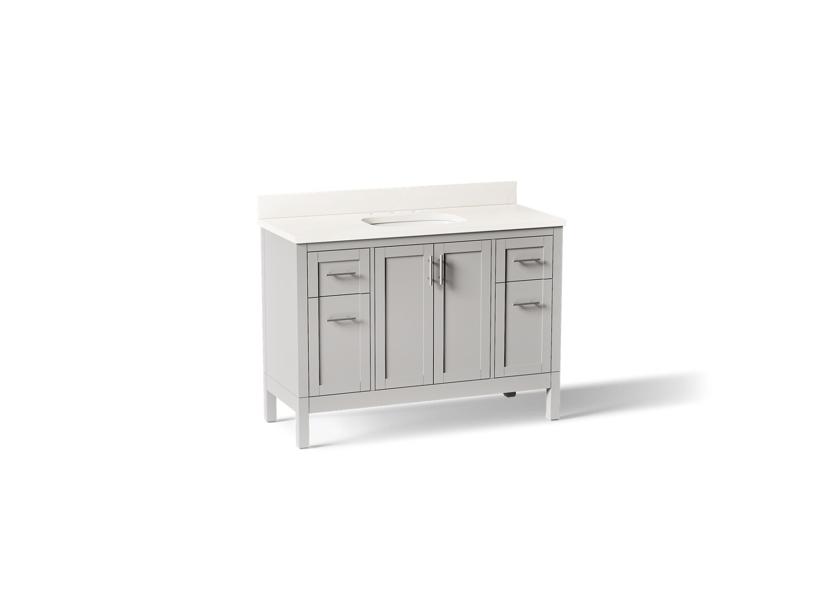 In typical Shaker style, the KOHLER® Hadron bathroom vanity set is a classic. This modest, clean design doesn’t overpower your bathroom — it blends into it — lending itself to many decorating styles. The Hadron 48" freestanding single sink vanity set includes cabinet, quartz countertop, sink, and Vibrant® Brushed Nickel hardware. Pair with any KOHLER® widespread bathroom sink faucet for your own unique touch.