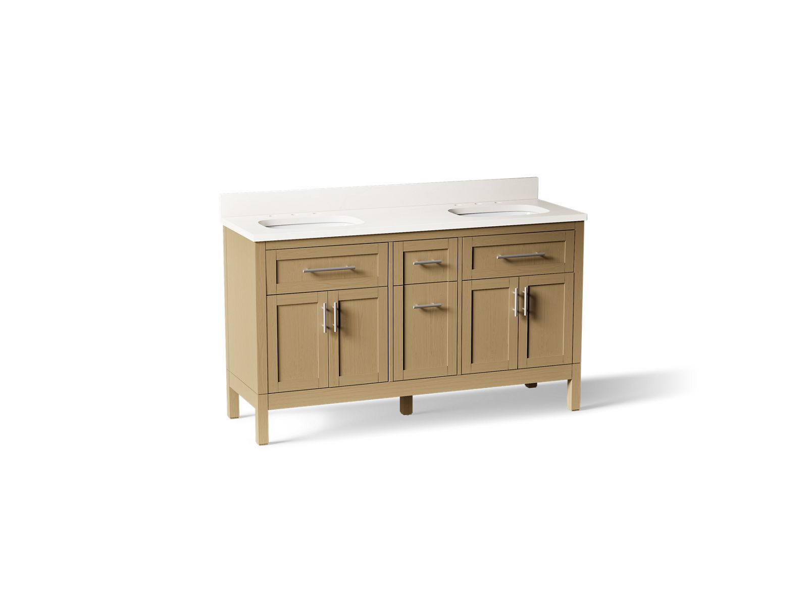 In typical Shaker style, the KOHLER® Hadron bathroom vanity set is a classic. This modest, clean design doesn’t overpower your bathroom — it blends into it — lending itself to many decorating styles. The Hadron 60" freestanding double sink vanity set includes cabinet, quartz countertop, two sinks, and Vibrant® Brushed Nickel hardware. Pair with any KOHLER® widespread bathroom sink faucets for your own unique touch.