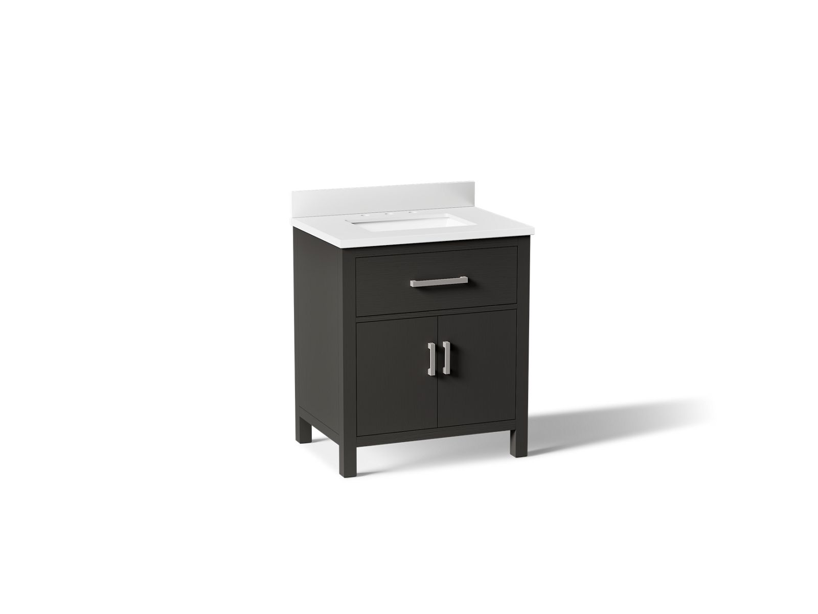 The KOHLER® Kresla vanity collection brings a quiet sophistication into your bathroom space with its with clean, architectural lines and range of finishes, and with its roomy interior, you'll find ample storage space to keep your bathroom organized and clutter-free. The Kresla 30" freestanding single sink vanity set includes cabinet, quartz countertop with matching backsplash, sink, and hardware. With KOHLER®, it’s easy to find the design solution that’s right for you.