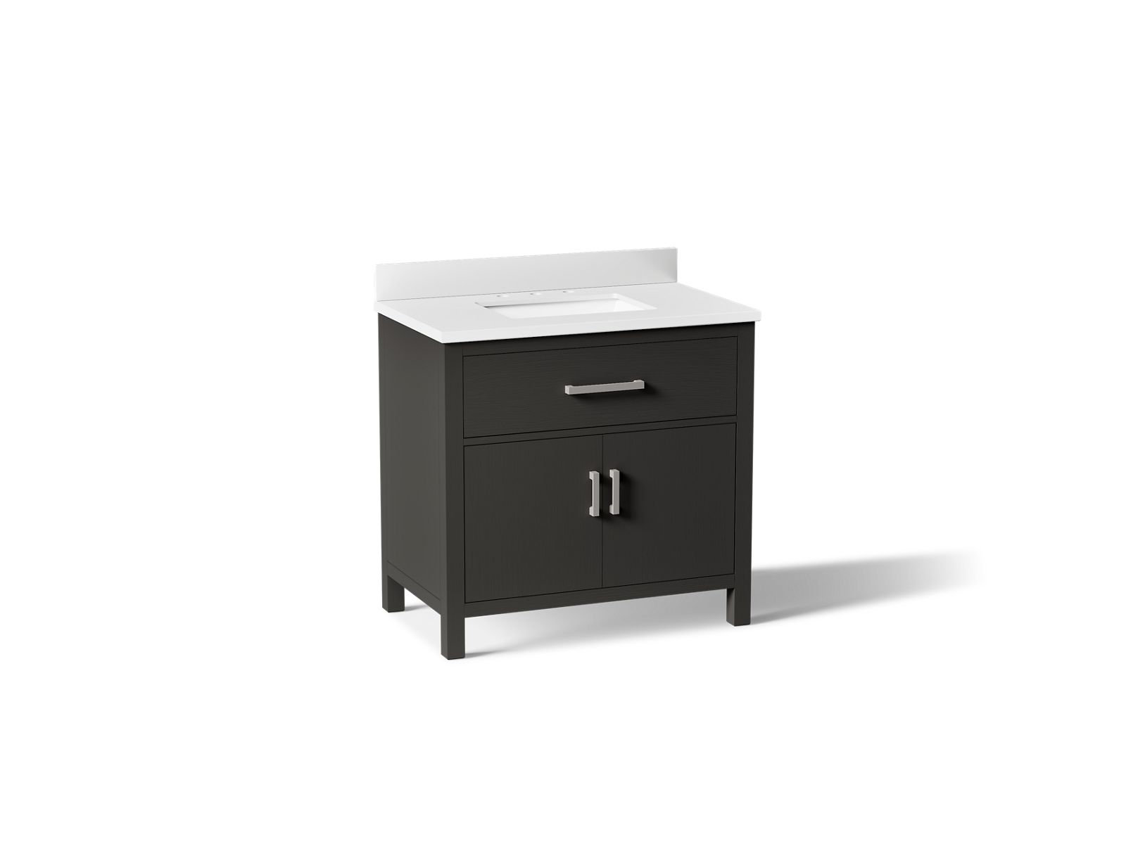 The KOHLER® Kresla vanity collection brings a quiet sophistication into your bathroom space with its with clean, architectural lines and range of finishes, and with its roomy interior, you'll find ample storage space to keep your bathroom organized and clutter-free. The Kresla 36" freestanding single sink vanity set includes cabinet, quartz countertop with matching backsplash, sink, and hardware. With KOHLER®, it’s easy to find the design solution that’s right for you.