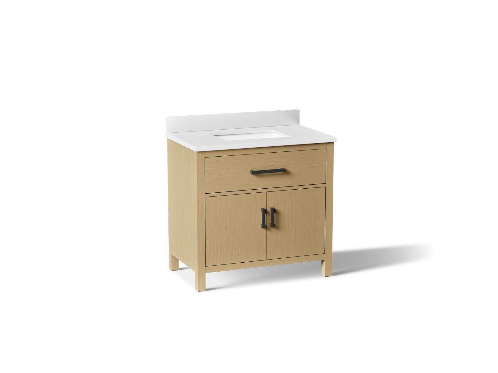 The KOHLER® Kresla vanity collection brings a quiet sophistication into your bathroom space with its with clean, architectural lines and range of finishes, and with its roomy interior, you'll find ample storage space to keep your bathroom organized and clutter-free. The Kresla 36" freestanding single sink vanity set includes cabinet, quartz countertop with matching backsplash, sink, and hardware. With KOHLER®, it’s easy to find the design solution that’s right for you.
