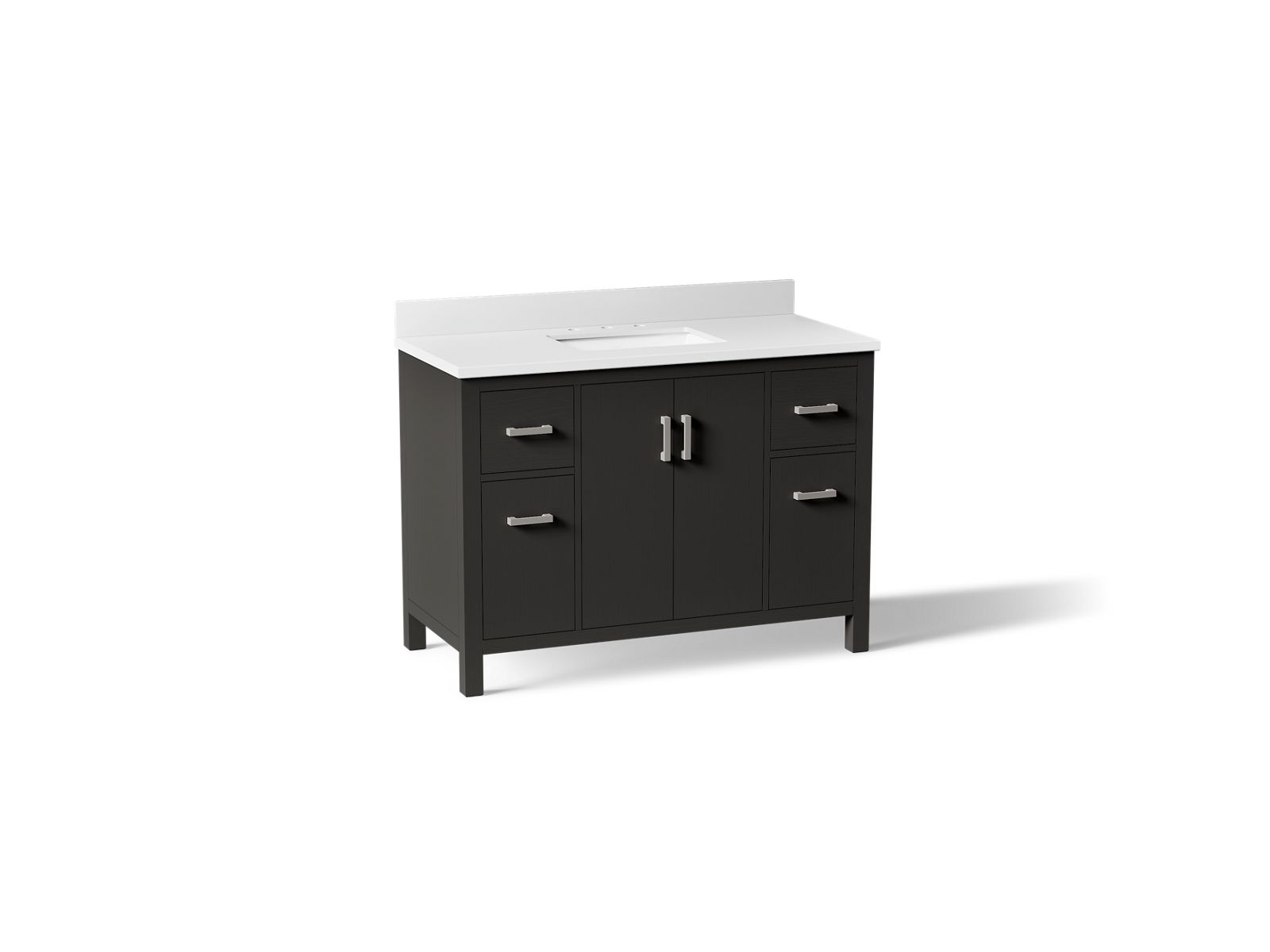 The KOHLER® Kresla vanity collection brings a quiet sophistication into your bathroom space with its with clean, architectural lines and range of finishes, and with its roomy interior, you'll find ample storage space to keep your bathroom organized and clutter-free. The Kresla 48" freestanding single sink vanity set includes cabinet, quartz countertop with matching backsplash, sink, and hardware. With KOHLER®, it’s easy to find the design solution that’s right for you.