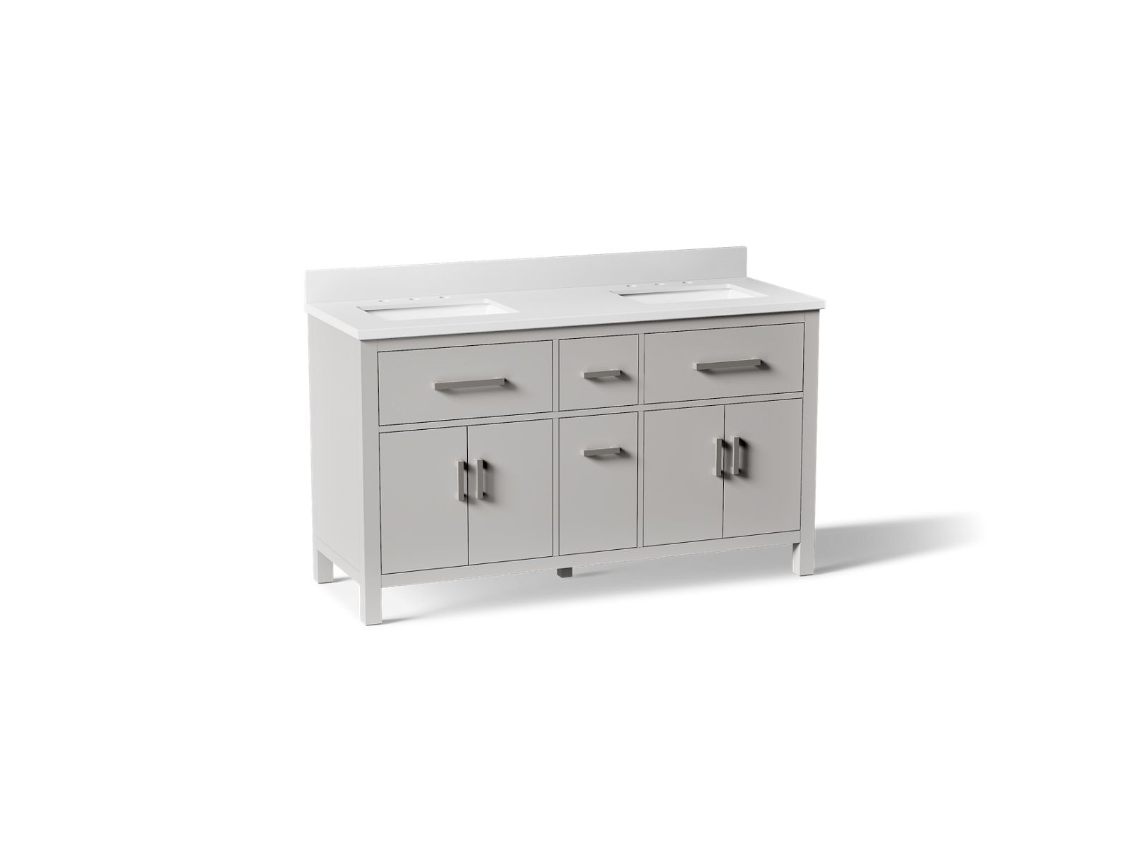 The KOHLER® Kresla vanity collection brings a quiet sophistication into your bathroom space with its with clean, architectural lines and range of finishes, and with its roomy interior, you'll find ample storage space to keep your bathroom organized and clutter-free. The Kresla 60" freestanding double sink vanity set includes cabinet, quartz countertop with matching backsplash, two sinks, and hardware. With KOHLER®, it’s easy to find the design solution that’s right for you.