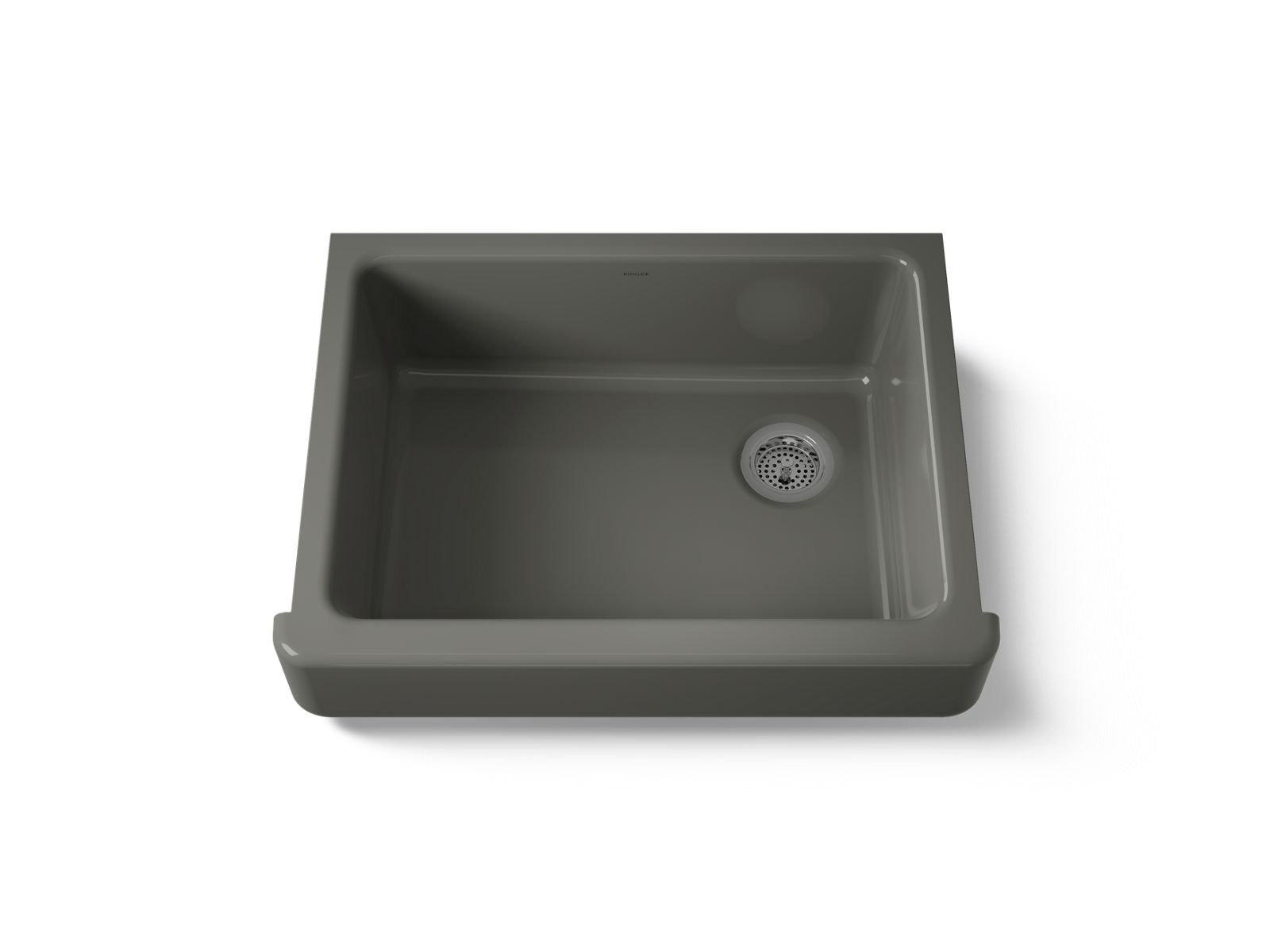 The KOHLER® Whitehaven apron-front kitchen sink features a streamlined and versatile farmhouse style. Perfect for remodeling projects, the Self-Trimming design requires only a rough cut to new or existing 30-inch standard cabinetry for simple installation and beautiful results. A large single basin accommodates large pots and pans, while the sloped bottom helps with draining and cleanup. Crafted from enameled cast iron, this sink resists chipping, cracking, or burning for years of beauty and reliable performance.
