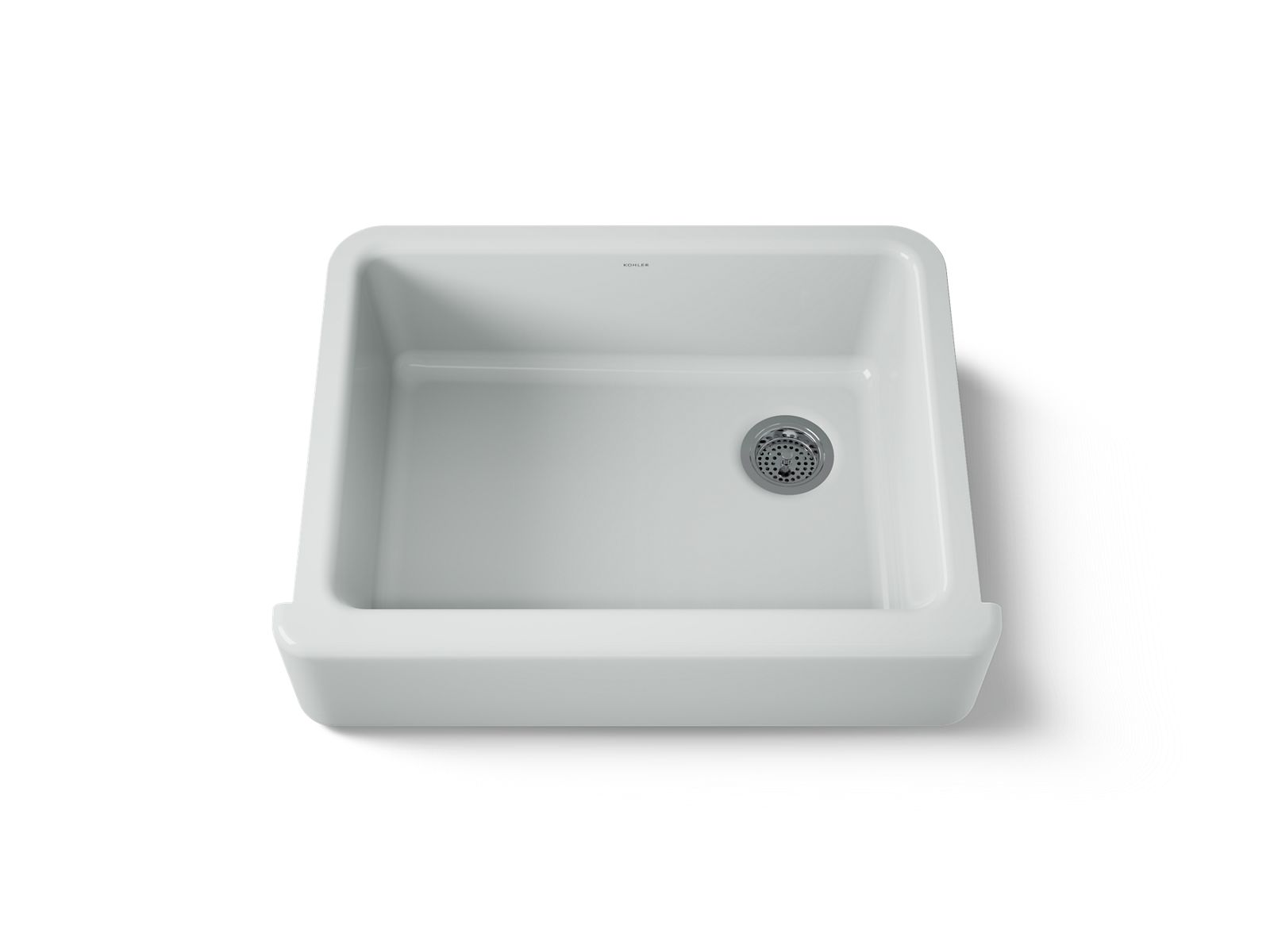 The KOHLER® Whitehaven apron-front kitchen sink features a streamlined and versatile farmhouse style. The Self-Trimming design requires only a simple rough cut, overlapping the cabinet face for beautiful results. The tall integral apron also acts as a drip edge to protect the cabinet from water damage. A large single basin accommodates large pots and pans, while the sloped bottom helps with draining and cleanup. Crafted from enameled cast iron, this sink resists chipping, cracking, or burning for years of beauty and reliable performance.