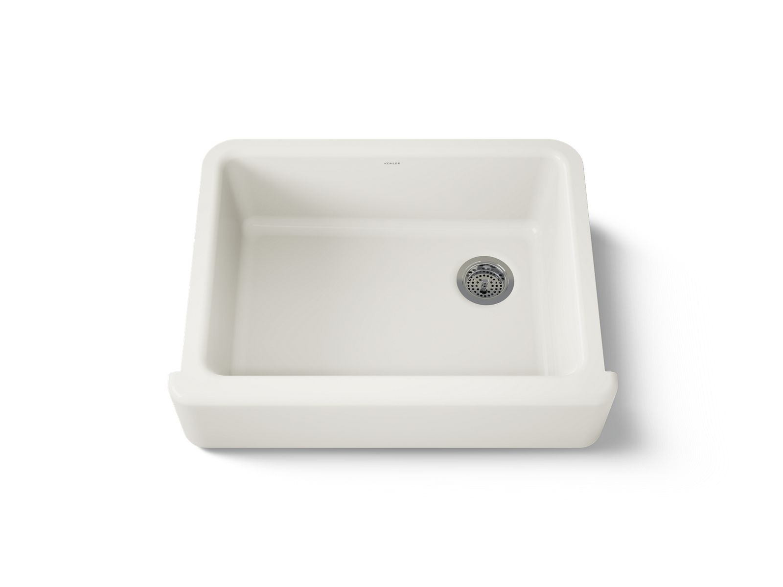 The KOHLER® Whitehaven apron-front kitchen sink features a streamlined and versatile farmhouse style. The Self-Trimming design requires only a simple rough cut, overlapping the cabinet face for beautiful results. The tall integral apron also acts as a drip edge to protect the cabinet from water damage. A large single basin accommodates large pots and pans, while the sloped bottom helps with draining and cleanup. Crafted from enameled cast iron, this sink resists chipping, cracking, or burning for years of beauty and reliable performance.