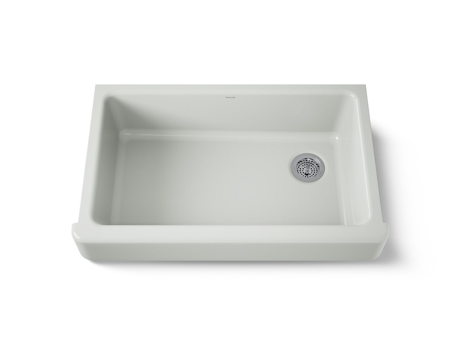 The KOHLER® Whitehaven apron-front kitchen sink features a streamlined and versatile farmhouse style to complement any decor. Perfect for remodeling projects, it has a shortened apron that allows for installation on most new or existing 36-inch standard cabinetry. The Self-Trimming design requires only a simple rough cut, overlapping the cabinet face for beautiful results and easy installation. A large single basin accommodates large pots and pans, while the sloped bottom helps with draining and cleanup. Crafted from enameled cast iron, this sink resists chipping, cracking, or burning for years of beauty and reliable performance.