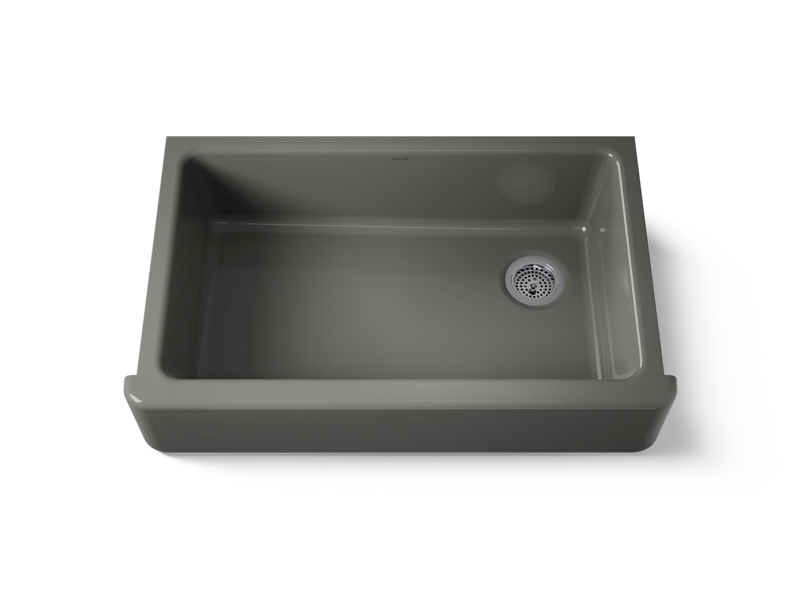 The KOHLER® Whitehaven apron-front kitchen sink features a streamlined and versatile farmhouse style to complement any decor. A large single basin accommodates large pots and pans, while the sloped bottom helps with draining and cleanup. Crafted from enameled cast iron, this sink resists chipping, cracking, or burning for years of beauty and reliable performance. A standard apron front makes it easy to install on 36-inch apron-front cabinetry. The Self-Trimming® design requires only a simple rough cut, overlapping the cabinet face for beautiful results.