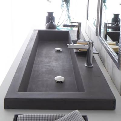 A bold focal point for larger bathrooms, the Trough 4819 effortlessly combines the functionality of two sinks with the style and convenience of one. The Trough 4819 concrete sink is artisan-crafted of NativeStone: an innovative blend of cement and natural jute fiber. NativeStone delivers resilience for heavy-duty tasks, in conjunction with a refreshingly easy cleanup.
